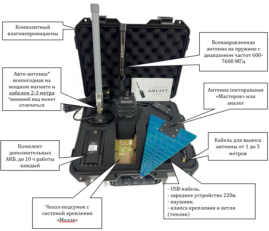 включает в себя наушники, дополнительную всенаправленную широкополосную антенну и USB-кабель с разъемом type-C.